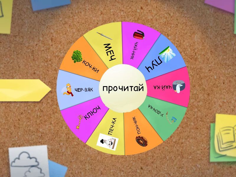 1) КОЧ-КИ 2) МЕЧ 3) ЧАЙ-НИК 4) ЛУЧ 5) ЧАЙ-КА 6) У-ДОЧ-КА 7) ПОН-ЧИК 8) ПЕЧ-КА 9) КЛЮЧ 10) ЧЕР-ВЯК