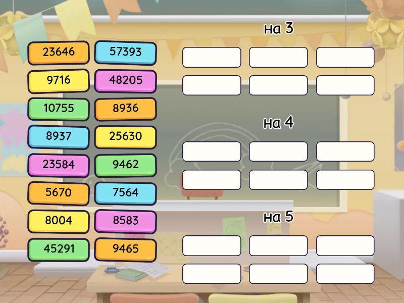 на 3: 8937, 9462, 57393, 23646, 8583, 45291, на 4: 8936, 23584, 7564, 9716, 8004, на 5: 9465, 25630, 48205, 5670, 10755,