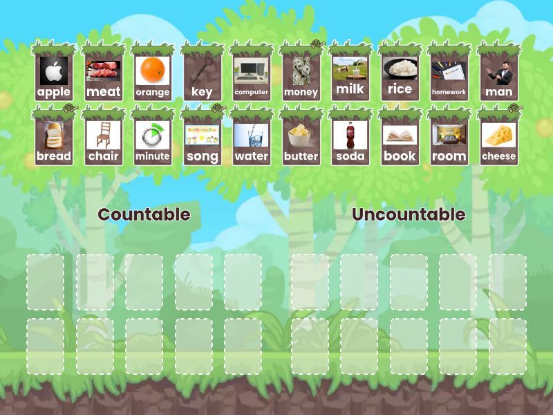 Countable: room, song, minute, man, chair, apple, book, key, computer, orange, Uncountable: milk, butter, cheese, water, homework, money, bread, rice, meat , soda,
