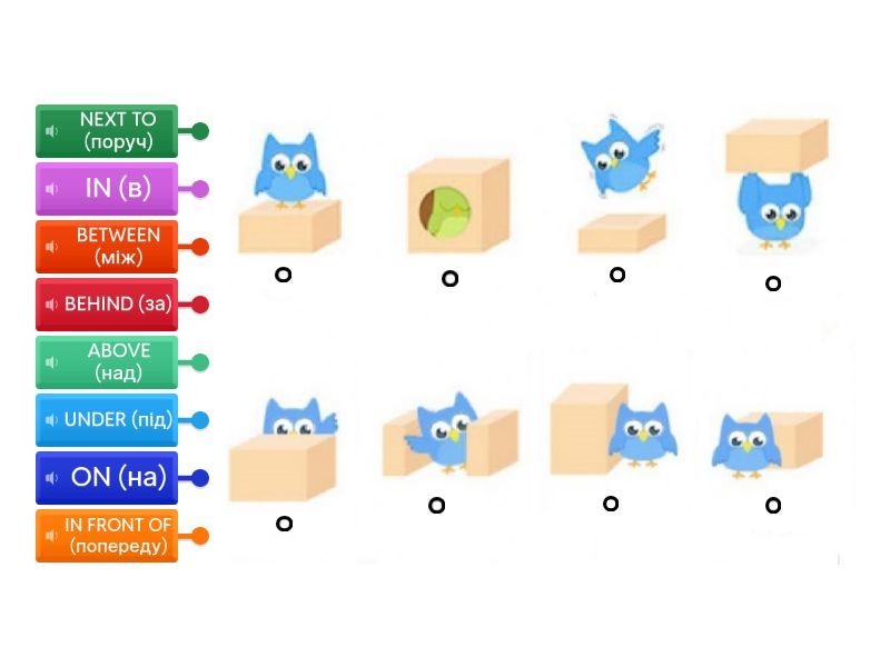 UNDER (під), BEHIND (за), IN FRONT OF (попереду), NEXT TO (поруч), IN (в), ON (на), ABOVE (над), BETWEEN (між).