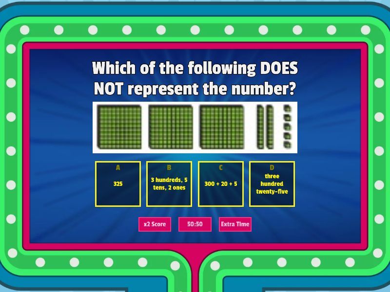 1) Which of the following DOES NOT represent the number? a) 325 b) 3 hundreds, 5 tens, 2 ones c) 300 + 20 + 5 d) three hundred twenty-five 2) Which of the following DOES NOT represent the number? a) 514 b) 5 hundreds, 1 ten, 4 ones c) 500 + 1 + 4 d) five hundred fourteen 3) Which of the following DOES NOT represent the number? a) 382 b) 3 hundreds, 8 tens, 2 ones c) 300 + 80 + 2 d) three hundred twenty-eight 4) Which of the following DOES NOT represent the number? a) 260 b) 2 hundreds, 6 ones c) 200 + 6 d) two hundred six 5) Which of the following DOES NOT represent the number? a) 695 b) 6 hundreds, 9 tens, 5 ones c) 600 + 9 + 5 d) six hundred ninety-five 6) Which of the following DOES NOT represent the number? a) 368 b) 3 hundreds, 8 tens, 6 ones c) 300 + 80 + 6 d) three hundred eighty-six 7) Which of the following DOES NOT represent the number? a) 1,160 b) 1 thousand, 1 hundred, 6 ones c) 1,000 + 100 + 60 d) one thousand one hundred sixty 8) Which of the following DOES NOT represent the number? a) 1,157 b) 1 thousand, 1 hundred, 5 tens, 7 ones c) 1,000 + 100 + 50 + 7 d) one thousand one hundred seventy-five 9) Which of the following DOES NOT represent the number? a) 1,185 b) 1 thousand, 1 hundred, 8 tens, 5 ones c) 1,000 + 10 + 80 + 5 d) one thousand one hundred eighty-five 10) Which of the following DOES NOT represent the number? a) 1,146 b) 1 thousand, 1 hundred, 6 tens, 4 ones c) 1,000 + 100 + 60 + 4 d) one thousand one hundred sixty-four 11) Which of the following DOES NOT represent the number? a) 1,132 b) 1 thousand, 1 hundred, 3 tens, 2 ones c) 1,000 + 100 + 30 + 2 d) one thousand one hundred twenty-three 12) Which of the following DOES NOT represent the number? a) 1,048 b) 1 thousand, 4 hundreds, 8 ones c) 1,000 + 40 + 8 d) one thousand forty-eight