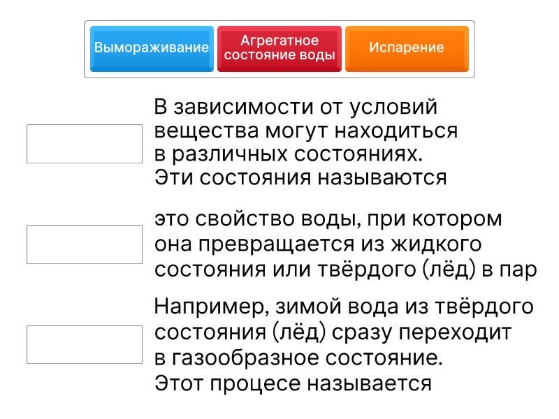 Агрегатное состояние воды - В зависимости от условий вещества могут находиться в различных состояниях. Эти состояния называются, Вымораживание - Например, зимой вода из твёрдого состояния (лёд) сразу переходит в газообразное состояние. Этот процесе называется, Испарение - это свойство воды, при котором она превращается из жидкого состояния или твёрдого (лёд) в пар,