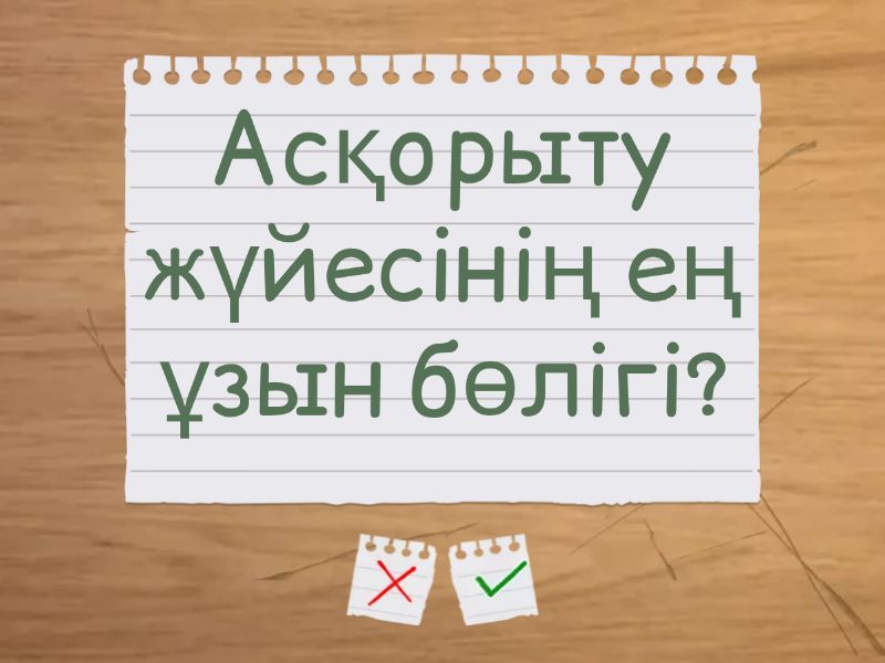 Сұрақ: Ас қорыту жүйесінің негізгі қызметі қандай? - Жауап: Ас қорыту және қоректік заттарды сіңіру., Сұрақ: Ас қорыту қай мүшеден басталады? - Жауап: Ауыз қуысынан., Сұрақ: Ауыз қуысында қандай фермент ас қорытуға қатысады? - Жауап: Амилаза (көмірсуларды ыдыратады)., Сұрақ: Қорытылмаған тағам қалдықтары ағзадан қалай шығарылады? - Жауап: Тік ішек арқылы нәжіс түрінде., Асқорыту жүйесінің ең ұзын бөлігі? - Аш ішек., Тоқ ішектің басты қызметі? - Судың сіңірілуі және нәжіс түзілуі.,