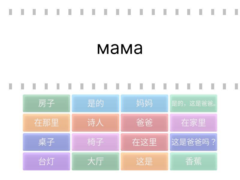 妈妈 - мама, 爸爸 - папа, 这是 - это, 房子 - дом, 椅子 - стул, 桌子 - стол, 香蕉 - банан, 诗人 - поэт, 台灯 - лампа, 是的 - да, 在这里 - тут, 在那里 - там, 大厅 - зал, 在家里 - дома, 这是爸爸吗? - Это папа?, 是的,这是爸爸。 - Да, это папа.,