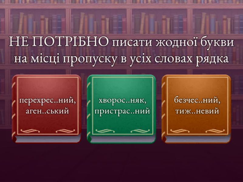 1) НЕ ПОТРІБНО писати жодної букви на місці пропуску в усіх словах рядка a) перехрес..ний, аген..ський b) хворос..няк, пристрас..ний c) безчес..ний, тиж..невий 2) Спрощення в групах приголосних треба позначати на письмі в усіх словах рядка a) блис..нути, улес..ливий b) гіган..ський, виїз..ний c) заздріс..но, випус..ний 3) Спрощення в групах приголосних треба позначати на письмі в усіх словах рядка a) перехрес..ний, абонен..ський b) доброчес..ний, якіс..ний c) безвиїз..ний, захис..ник 4) Спрощення в групах приголосних на місці пропуску позначається на письмі в усіх словах рядка a) зап\'яс..ний, контрас..ний b) блис..нути, влас..ний, c) безжаліс..ний, кіс..лявий