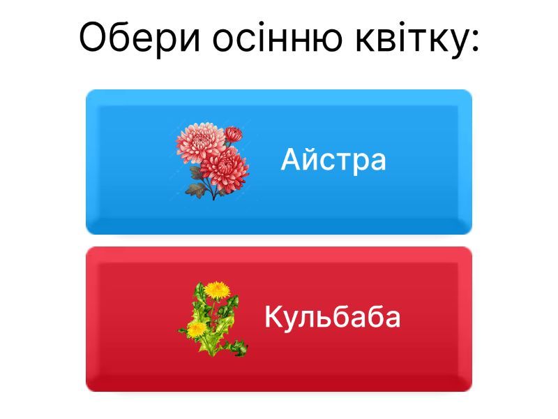 1) Обери осінню квітку: a) Айстра   b) Кульбаба 2) Обери осінню квітку: a) Іриси b) Ехінацея 3) Обери осінню квітку: a) Жоржина b) Нарциси 4) Обери осінню квітку: a) Календула b) Півонія 5) Обери осінню квітку: a) Ромашка b) Петунія 6) Обери осінню квітку: a) Тюльпани b) Чорнобривці 7) Обери осінню квітку: a) Хризантема b) Фіялка