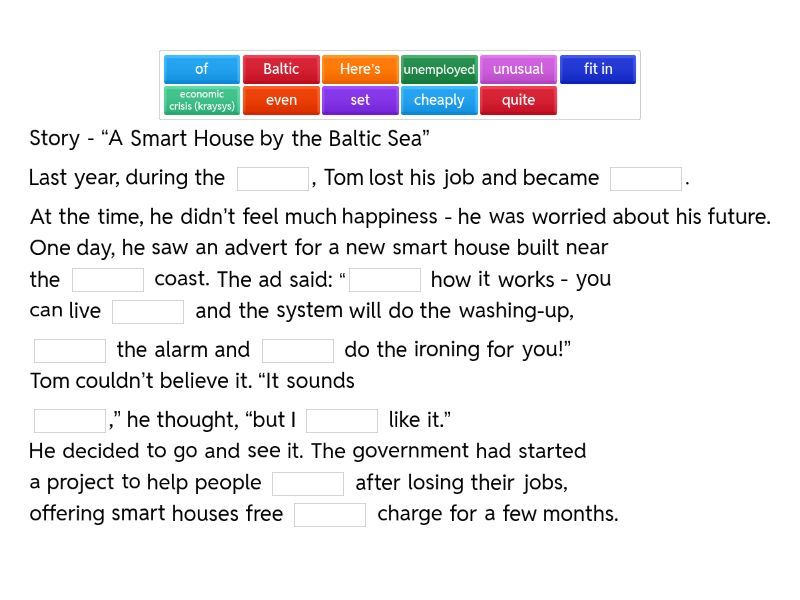 Story - “A Smart House by the Baltic Sea” Last year, during the ____, Tom lost his job and became ____. At the time, he didn’t feel much happiness - he was worried about his future. One day, he saw an advert for a new smart house built near the ____ coast. The ad said: “____ how it works - you can live ____ and the system will do the washing-up, ____ the alarm and ____ do the ironing for you!” Tom couldn’t believe it. “It sounds ____,” he thought, “but I ____ like it.” He decided to go and see it. The government had started a project to help people ____ after losing their jobs, offering smart houses free ____ charge for a few months. When Tom arrived, the voice said “Welcome, Tom! Please tell me the ____ and exact time of your arrival.” He laughed - “This house is smarter than me!” The robot pinged and the door banged every day. Slowly, he began to feel better. He started a ____ for other people living in smart houses and even met a therapist who helped him find a new goal - ____ by designing homes for others. Now Tom often says, “One thing is ____ - sometimes technology can really ____ your life.” From my point of view... To ____ honest... As I see it... I’m not sure, but I think... I ____ that... For me, the most important thing is... What ____ / don’t like about it is... Rozwijanie wypowiedzi Let me ____ why. The ____ that... Another thing is that... For example... I’d like to add that... ____ more... Podsumowanie To ____... All in all... In ____... Finally, I’d say that... 1. In my opinion, technology ____ in our lives, but sometimes it can make people feel lonely. 2. From my ____, happiness doesn’t depend on money - it depends ____ how we feel inside. 3. To be ____, I quite like the idea of living in a smart house, because it can save time and make life easier. 1. Why do people ____ for themselves? 2. Why are ____ important for building trust between people? 3. How can technology ____ a difference in everyday life? 4. Why is it sometimes difficult to ____ with a new group or community? 5. Do you ever stand in a ____ something important? 6. ____ eating dinner in a smart house where robots serve your food - would it be better or worse than a restaurant? 7. Imagine eating in a café run by robots - it would be interesting but a bit unusual. 1. In my opinion, helping others ____ even if it’s a small act. 2. From my point of view, we need to protect our planet - that should be a basic principle. 3. I believe that therapists and psychologists ____ in modern society. 4. To be honest, I don’t think technology can ____ human contact. 5. ____ people care about each other, there will always be happiness in the world.