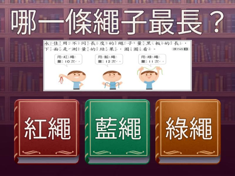 1) 哪一條繩子最長? a) 紅繩 b) 藍繩 c) 綠繩 2) 哪一條繩子最短? a) 紅繩 b) 藍繩 c) 綠繩 3) 有多長? a) 12 b) 8 c) 4 d) 6 4) 有多長? a) 10 b) 5 c) 20 d) 6 5) 有多長? a) 7 b) 13 c) 8 d) 6 6) 有多長? a) 11 b) 14 c) 3 d) 4 7) 玉米筍有多長? a) 5 b) 12 c) 10 d) 7 8) 蝴蝶多飛幾公分? a) 3 b) 5 c) 8 d) 13