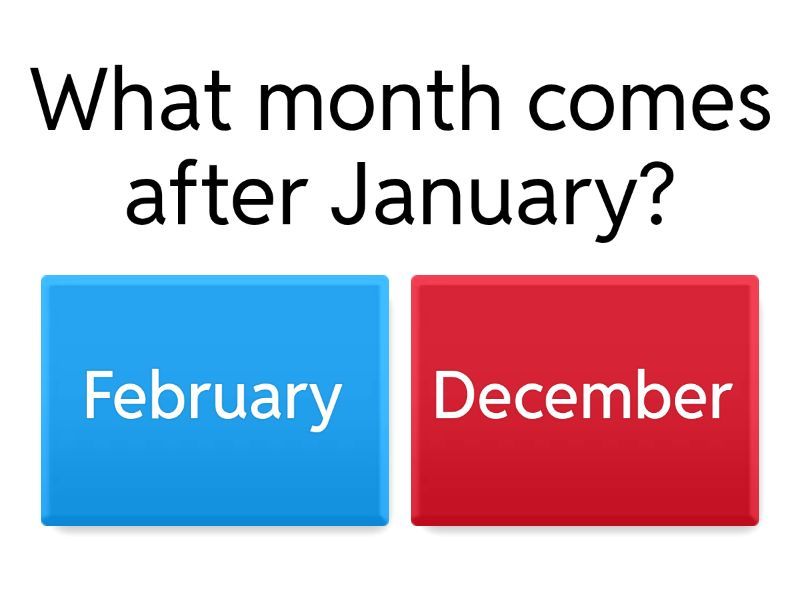 1) What month comes after January? a) February b) December 2) What month comes before March? a) February b) April 3) The last month of the year is _____. a) November b) December 4) We celebrate New Year’s Day in _____. a) January b) July 5) The month after June is _____. a) July b) May 6) April comes before _____. a) March b) May 7) There are 12 months in a _____. a) week b) year 8) August is the _____ month of the year. a) eighth b) ninth 9) October comes after _____. a) September b) November 10) Christmas is in _____. a) December b) January