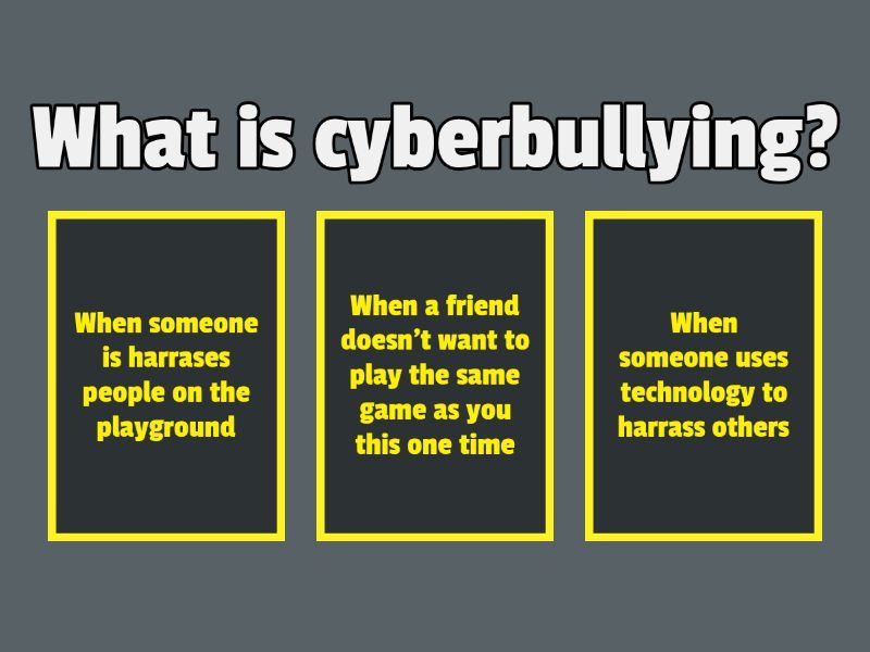 1) What is cyberbullying? a) When someone is harrases people on the playground b) When a friend doesn't want to play the same game as you this one time c) When someone uses technology to harrass others 2) If you are threatening someone online, is this classed as cyberbullying? a) No, I was only joking around b) Yes, I should not have done that c) Maybe, but I am not sure 3) In the video you watched, what did someone do to Molly? a) Someone spread a video of her online without permission b) Someone spread a funny cat video online c) Someone spread a scary video online 4) Who should you go to for help if you are being cyberbullied? a) I can handle it myself, I dont need help b) No one, I will bully back c) A trusted adult 5) No one deserves to be hurt online a) True b) False 6) If I am experiencing cyberbullying, how should I respond? (more than one answer) a) Report Rport Report b) Attack back c) Block the bully d) Do not respond immediately 7) What should you "be" while online? a) Be Safe b) Be Responsible c) Be Respectful d) Be Mean 8) If you are being cyberbullied, is it your fault? a) Yes, I should not have said that b) Doesn't everyone get cyberbullied c) No, no one deserves to be hurt online