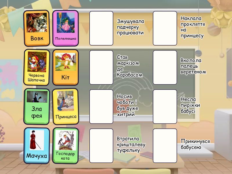 Попелюшка - Втратила кришталеву туфельку, Зла фея - Наклала прокляття на принцесу, Господар кота - Став маркізом де Карабасом, Мачуха - Змушувала падчерку працювати, Вовк - Прикинувся бабусею, Кіт - Носив чоботи і був дуже хитрий , Принцеса - Вколола палець веретеном, Червона Шапочка - Несла пиріжки бабусі ,
