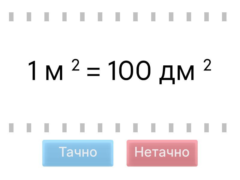 Тачно: 1 м 2  = 100 дм 2, 1 дм 2 = 100 цм 2 , 1 цм 2 = 100 мм 2, 1 м 2 = 10 000 цм 2 , 1 дм 2 = 10 000 мм 2 , 1 м 2  = 1 000 000 мм 2 , 1 м 2 = 100 дм 2 = 10 000 цм 2 = 1 000 000 мм 2, Нетачно: 1 м 2 = 100 дм , 1 дм 2 =  100 цм , 1 цм 2 = 1000 мм  , 1м 2 = 10 000 цм, 1 дм 2 = 10 000 мм , 1 м 2 = 1 000 000 мм , 1 м 2 = 100 дм 2 = 10 000 цм = 1 000 000 мм,