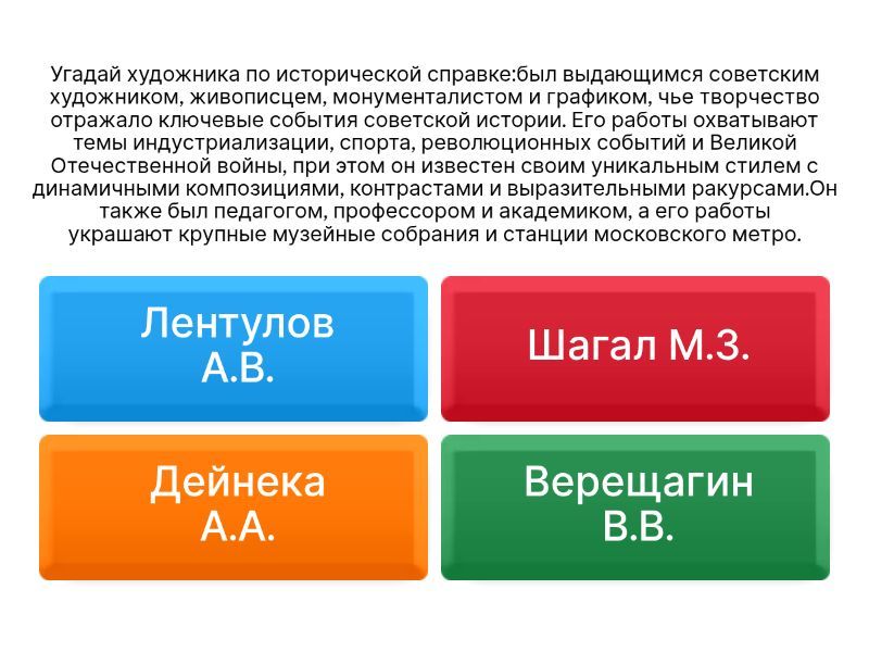 1) Угадай художника по исторической справке:был выдающимся советским художником, живописцем, монументалистом и графиком, чье творчество отражало ключевые события советской истории. Его работы охватывают темы индустриализации, спорта, революционных событий и Великой Отечественной войны, при этом он известен своим уникальным стилем с динамичными композициями, контрастами и выразительными ракурсами.Он также был педагогом, профессором и академиком, а его работы украшают крупные музейные собрания и станции московского метро. a) Лентулов А.В. b) Шагал М.З. c) Дейнека А.А. d) Верещагин В.В. 2) В каком произведении автор использует данный композиционный приём a) b) c) d) 3) В каком произведении автор использует данный композиционный приём a) b) c) d) 4) Какой композиционный приём используется a) b) c) d) 5) Какой композиционный приём используется a) b) c) d)