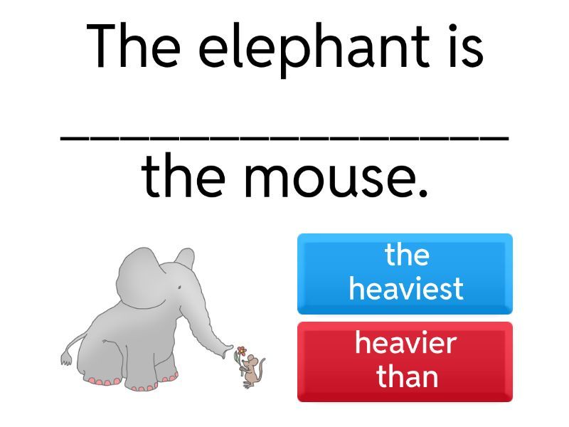 1) The elephant is _______________ the mouse. a) the heaviest b) heavier than 2) The dog is _______________ the giraffe. a) the shortest b) shorter than 3) John is ____________. a) the oldest b) the youngest 4) The whale is _______________ animal. a) the largest b) the large 5) The giraffe is _______________ the lion. a) tallest than b) taller than 6) The snake is ____________ the hippo. a) thinner than b) taller than 7) The __________ is shorter than the _________. a) elephant / mouse b) mouse / elephant 8) The zebra is taller than ________. a) the whale b) the cat 9) What is the heaviest animal? a) The cat b) The snake c) The hippo d) The lion 10) Who is older than Julia? a) Eduardo is oldest than Julia. b) Eric is oldest than Julia. c) Eduardo is older than Julia. d) Eric is older than Julia.