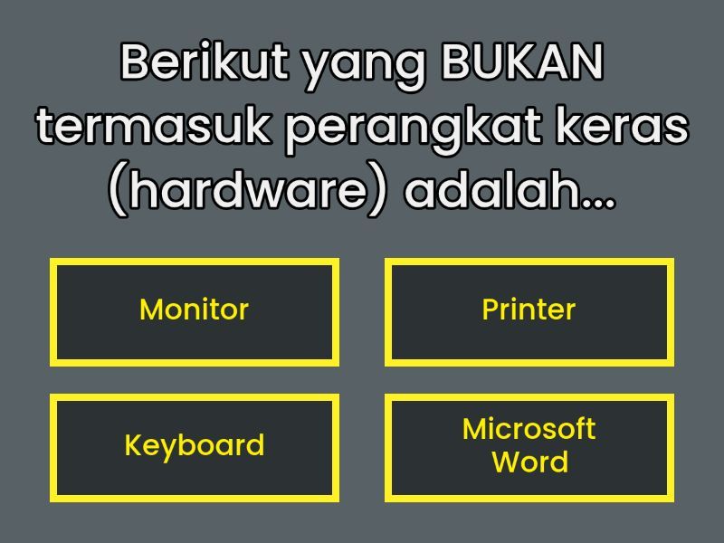 1) Berikut yang BUKAN termasuk perangkat keras (hardware) adalah... a) Monitor b) Printer c) Keyboard d) Microsoft Word 2) Perangkat yang berfungsi untuk memproses data dan dianggap sebagai "otak" komputer adalah... a) Keyboard b) CPU c) Mouse d) Printer 3) Orang yang mengoperasikan komputer disebut... a) Hardware b) Software c) Brainware d) Pemograman 4) Sistem bilangan yang digunakan dalam pengalamatan memori komputer adalah... a) Biner b) Oktal c) Desimal d) Heksadesimal 5) Untuk memasukkan perintah teks dan angka ke dalam komputer, perangkat yang digunakan adalah... a) Mouse b) Scanner c) Keyboard d) Speaker 6) Satuan data terkecil pada komputer adalah... a) Byte b) Bit c) Kilo d) Mega 7) Bagian dari CPU yang berfungsi menghubungkan seluruh bagian dari CPU tersebut adalah .... a) Control Unit b) Arithmetic And Logic Unit c) Register d) CPU Interconnection 8) Hardware yang berfungsi sebagai alat penunjuk untuk mengatur posisi kursor di layar adalah …. a) Monitor b) Printer c) Mouse d) Speaker 9) Sistem komputer terdiri dari 3 (tiga) unsur berikut, kecuali .... a) Brainware b) Mailware c) Hardware d) Software 10) Alat yang digunakan untuk memindai gambar agar dapat diolah secara digital adalah … a) keyboard b) Mouse c) Scanner d) Touch