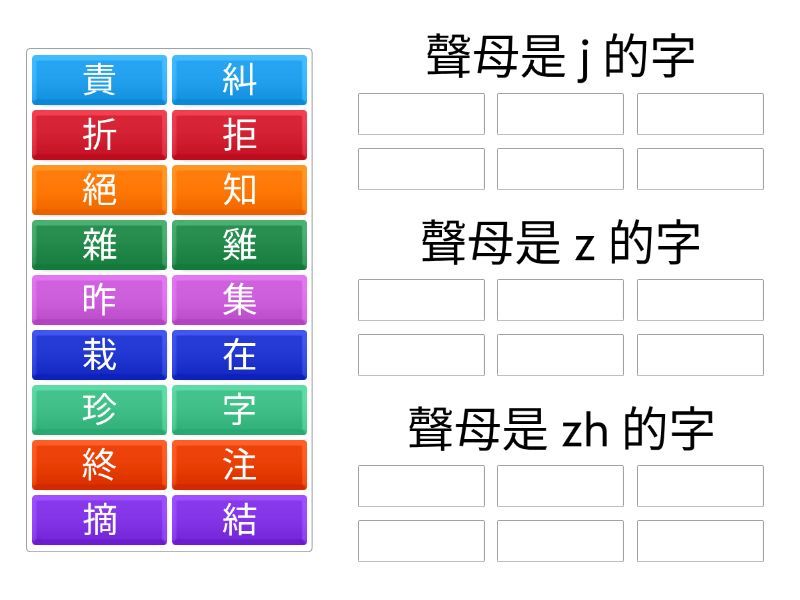 聲母是 j 的字: 糾, 結, 雞, 拒, 絕, 集, 聲母是 z 的字: 在, 字, 栽, 昨, 雜, 責, 聲母是 zh 的字: 摘, 折, 終, 知, 珍, 注,