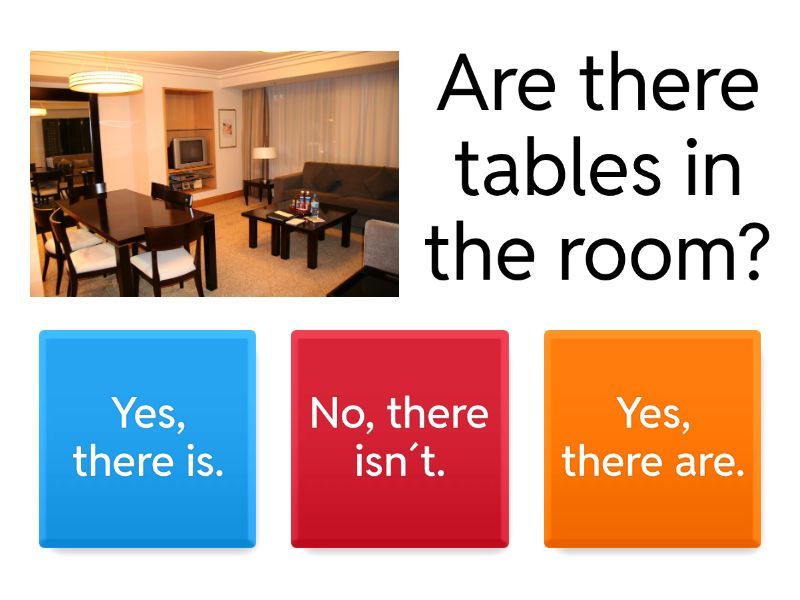 1) Are there tables in the room? a) Yes, there is. b) No, there isn´t. c) Yes, there are. 2) Is there a bed in the room? a) Yes, there is. b) No, there isn´t. c) Yes, there are. 3) Are there two microwave ovens in the kitchen? a) Yes, there are. b) No, there isn´t. c) No, there aren´t 4) Is there a TV in the room? a) Yes, there is. b) No, there isn´t c) Yes, there are. 5) Are there six chairs in the room? a) Yes, there is. b) No, there isn´t. c) No, there aren´t. 6) Is there a car in the garage? a) Yes, there is. b) Yes, there are. c) No, there isn´t. 7) Is there an armchair in this room? a) Yes, there are. b) No, there isn´t c) Yes, there is. 8) Is there a sofa in this room? a) Yes, there are. b) Yes, there is. c) No, there aren´t 9) Is there a fridge in this kitchen? a) No, there isn´t. b) Yes, there is. c) No, there aren´t 10) Is there a picture in the room? a) Yes, there are. b) No, there isn´t. c) Yes, there is.