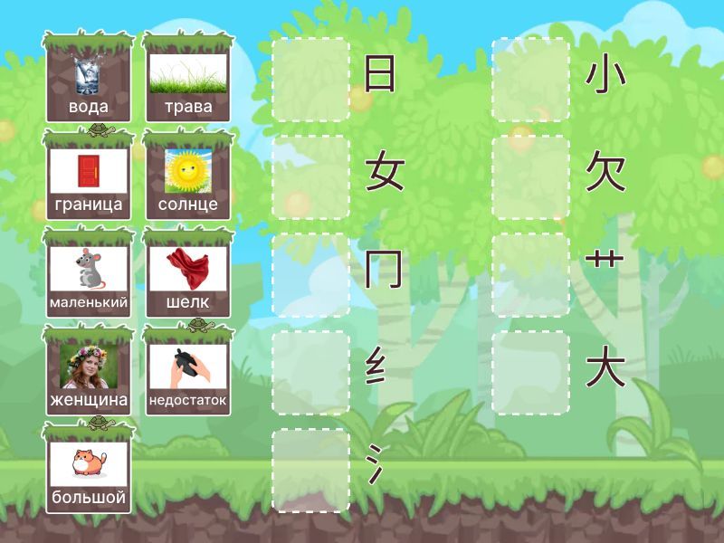 ребёнок - 子, вода - 氵, женщина - 女, солнце - 日, рот - 口, огонь - 灬, человек - 人, большой - 大, маленький - 小, ученый, воин - 士, недостаток - 欠, страница - 页, шелк - 纟, трава - 艹, речь - 讠, ходьба - 走, ладонь, еще, правая рука - 又, граница - 冂,