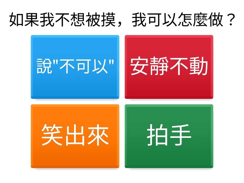 1) 如果我不想被摸,我可以怎麼做? a) 說"不可以" b) 安靜不動 c) 笑出來 d) 拍手 2) 誰可以碰我的身體? a) 陌生人 b) 所有人 c) 我同意的人 d) 網友 3) 如果有人讓我不舒服,我該怎麼辦? a) 忍耐 b) 躲起來 c) 離開教室 d) 告訴大人 4) 身體的哪些地方不可以隨便給別人看? a) 手臂 b) 私密部位 c) 臉 d) 手指 5) 當別人說"不可以"時,我應該? a) 繼續做 b) 裝沒聽到 c) 更大聲 d) 停下來 6) 我洗澡或換衣服的地方應該是? a) 教室 b) 客廳 c) 廁所或浴室 d) 操場 7) 可以跟陌生人走嗎? a) 可以 b) 如果對方請吃糖果 c) 看心情 d) 不行 8) 我覺得害怕或緊張,可以跟誰說? a) 信任的大人 b) 陌生人 c) 隨便一個人 d) 不說 9) 如果有人偷看我換衣服,我該? a) 忍耐 b) 大叫和告訴老師 c) 假裝沒事 d) 笑一笑 10) 當我不舒服時,我的感覺是? a) 正常的 b) 要注意 c) 可以不理 d) 沒關係