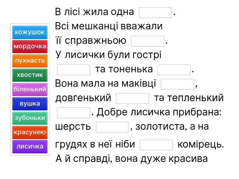 В лісі жила одна ____. Всі мешканці вважали її справжньою ____. У лисички були гострі ____ та тоненька ____. Вона мала на маківці ____, довгенький ____ та тепленький ____. Добре лисичка прибрана: шерсть ____, золотиста, а на грудях в неї ніби ____ комірець. А й справді, вона дуже красива Калина — чарівний та яскравий ____. Навесні ____ приваблює своїми ____, білим лебединим цвітом, а восени — червоними ____, що палахкотять ясним вогнем у променнях осіннього ____. ____ калини восени жовкне, а потім падає на землю. Калина — дуже гарна ____.