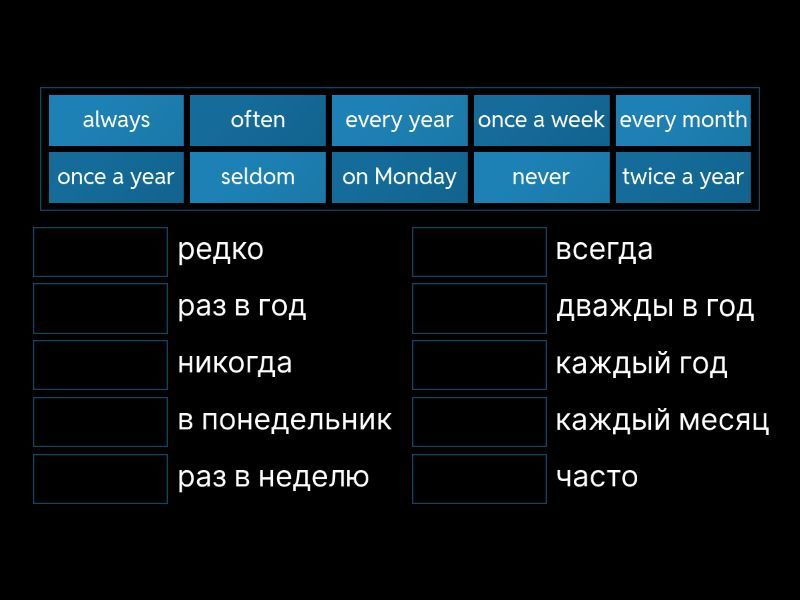 always - всегда, often - часто, usually  - обычно, sometimes - иногда, seldom - редко, never - никогда, once a week - раз в неделю, twice a week - дважды в неделю, three times a week - трижды в неделю, once a month - раз в месяц, twice a month - дважды в месяц, once a year - раз в год, twice a year - дважды в год, every day - каждый день, every week - каждую неделю, every month - каждый месяц, every year - каждый год, on Monday - в понедельник, on Mondays - по понедельникам,