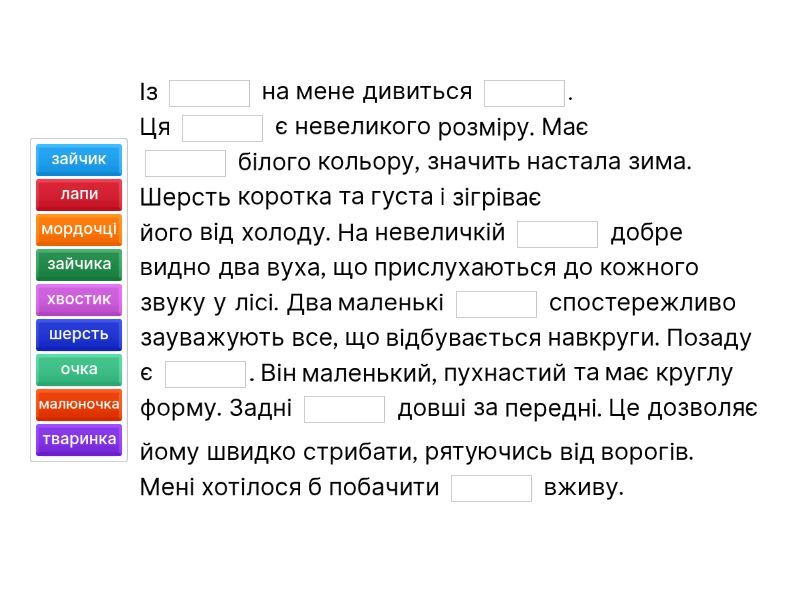 Із ____ на мене дивиться ____. Ця ____ є невеликого розміру. Має ____ білого кольору, значить настала зима. Шерсть коротка та густа і зігріває його від холоду. На невеличкій ____ добре видно два вуха, що прислухаються до кожного звуку у лісі. Два маленькі ____ спостережливо зауважують все, що відбувається навкруги. Позаду є ____. Він маленький, пухнастий та має круглу форму. Задні ____ довші за передні. Це дозволяє йому швидко стрибати, рятуючись від ворогів. Мені хотілося б побачити ____ вживу.