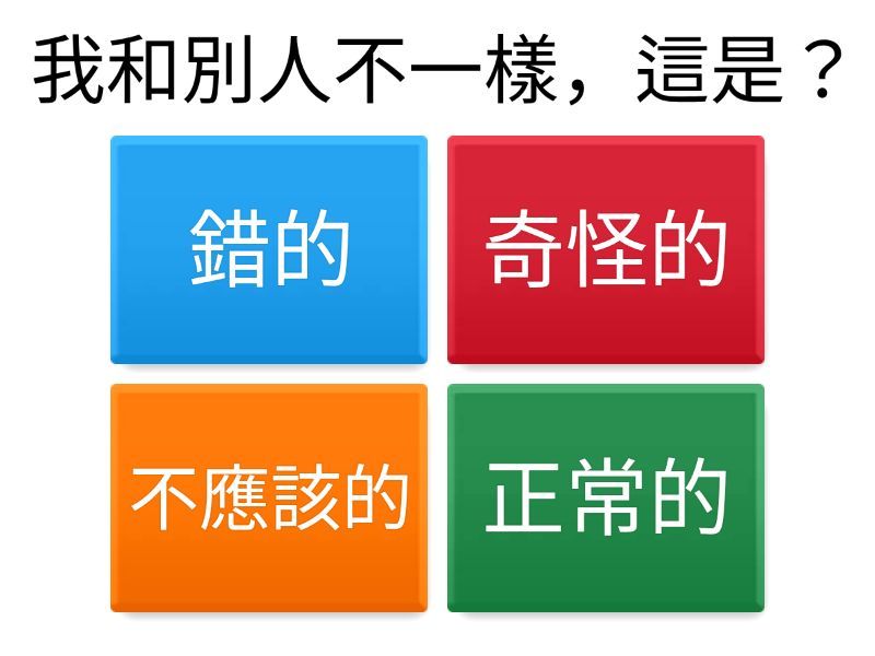 1) 我和別人不一樣,這是? a) 錯的 b) 奇怪的 c) 不應該的 d) 正常的 2) 每個人都有不同的性格,應該? a) 嘲笑別人 b) 批評別人 c) 尊重差異 d) 叫他改變 3) 我喜歡的東西和別人不一樣,代表? a) 我有自己的喜好 b) 我不正常 c) 我要改變 d) 我不應該喜歡 4) 男生可以喜歡畫畫嗎? a) 不可以 b) 可以 c) 要看別人說 d) 只可以打球 5) 女生可以喜歡打籃球嗎? a) 可以 b) 要問老師 c) 不行 d) 看同學同不同意 6) 我有自己的情緒,代表? a) 我很壞 b) 我是人,有感覺是正常的 c) 我應該忍耐 d) 我不可以生氣 7) 如果我覺得難過,我可以? a) 打人 b) 忍著不說 c) 罵別人 d) 告訴信任的大人 8) 每個人都有優點和缺點,應該? a) 接受自己 b) 只看缺點 c) 看不起自己 d) 假裝沒缺點 9) 如果我對自己生氣,可以? a) 打自己 b) 吵架 c) 深呼吸冷靜下來 d) 不講話 10) 我喜歡自己,是因為? a) 別人喜歡我 b) 我比別人好 c) 我最聰明 d) 我有自己的特色