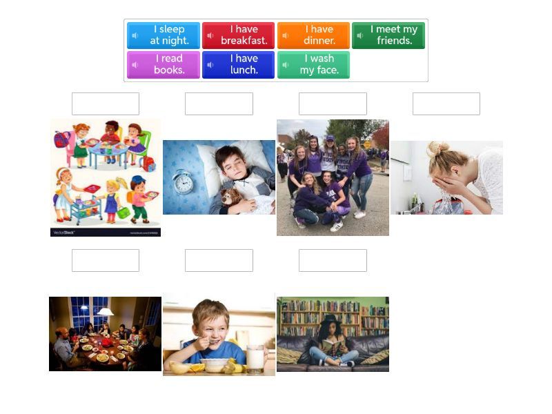 I wake up early., I wash my face., I have breakfast., I go to school., I have lunch., I come home., I meet my friends., I sleep at night., I have dinner., I watch tv., I read books., I do some sports., I do my homework.,