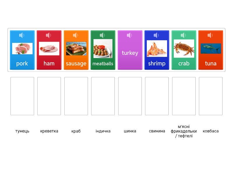 beef - яловичина, pork - свинина, chicken - курятина, lamb - баранина / ягнятина, sausage - ковбаса, bacon - бекон, fish - риба, salmon - лосось, tuna - тунець, shrimp - креветка, crab - краб, seafood - морепродукти, steak - стейк, meatballs - м’ясні фрикадельки / тефтелі, ham - шинка, turkey - індичка,