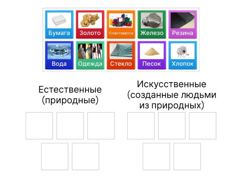 Естественные (природные): Хлопок , Железо, Вода , Песок, Золото , Искусственные (созданные людьми из природных): Пластмасса , Стекло , Бумага , Резина , Одежда ,