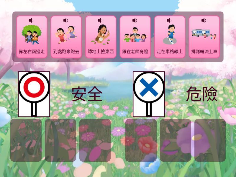 安全: 跟在老師身邊, 靠左右兩邊走, 排隊輪流上車, 危險: 到處跑來跑去, 蹲地上撿東西, 走在車格線上,