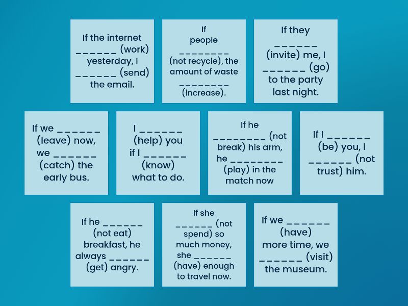 If we ______ (leave) now, we ______ (catch) the early bus. - If we leave now, we will catch the early bus.f he ______ (not eat) breakfast, he always ______ (get) angry., If he ______ (not eat) breakfast, he always ______ (get) angry. - If he doesn't eat breakfast, he always gets angry., I ______ (help) you if I ______ (know) what to do. - I would help you if I knew what to do., If they ______ (invite) me, I ______ (go) to the party last night. - If they had invited me, I would have gone to the party..., If she ______ (not spend) so much money, she ______ (have) enough to travel now. - If she hadn't spent so much money, she would have enough to travel now., If I ______ (be) you, I ______ (not trust) him. - If I were you, I wouldn't trust him., If the internet ______ (work) yesterday, I ______ (send) the email. - If the internet had worked yesterday, I would have sent the email., If we ______ (have) more time, we ______ (visit) the museum. - If we had more time, we would visit the museum., If people ________ (not recycle), the amount of waste ________ (increase). - If people don't recycle, the amount of waste increases., If he ________ (not break) his arm, he ________ (play) in the match now - If he hadn't broken his arm, he would play in the match now,