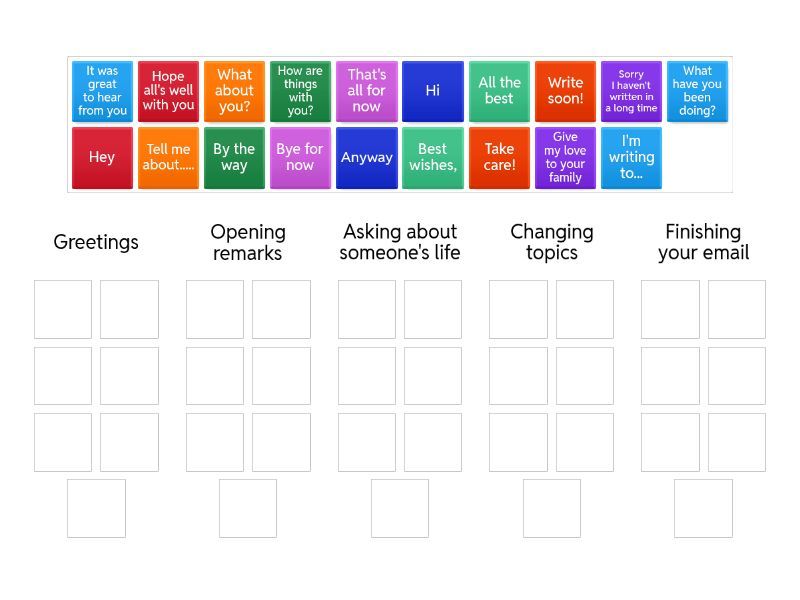 Greetings: Hi, Hey, Opening remarks: It was great to hear from you, I'm writing to..., Hope all's well with you, Sorry I haven't written in a long time, Asking about someone's life: What about you?, How are things with you?, What have you been doing?, Tell me about....., Changing topics: By the way, Anyway, Finishing your email: Take care!, Best wishes,, Write soon!, That's all for now, Bye for now, All the best, Give my love to your family,