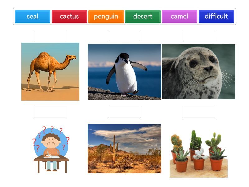 desert, difficult, camel, cactus, seal, penguin,