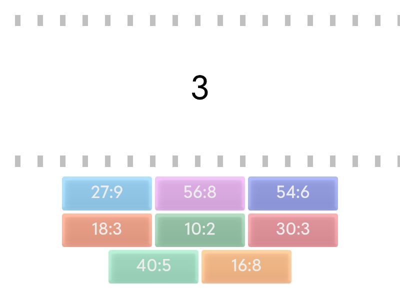 27:9 - 3, 30:3 - 10, 16:8 - 2, 10:2 - 5, 56:8 - 7, 54:6 - 9, 40:5 - 8, 18:3 - 6,