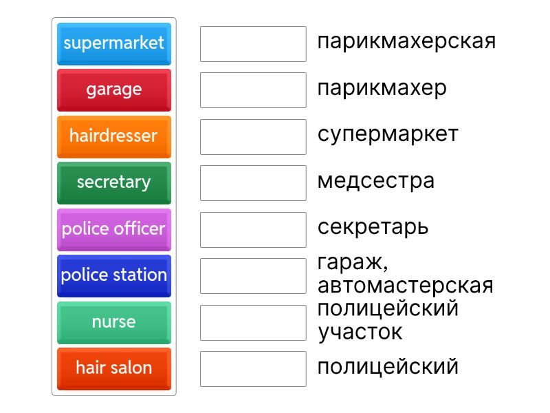 garage - гараж, автомастерская, hospital - больница, police station - полицейский участок, hair salon - парикмахерская, library - библиотека, office - офис, leisure centre - развлекательный центр, supermarket - супермаркет, fitness instructor - фитнес инструктор, librarian - библиотекарь, secretary - секретарь, nurse - медсестра, police officer - полицейский, mechanic - механик, автослесарь, shop assistant - продавец консультант, hairdresser - парикмахер,