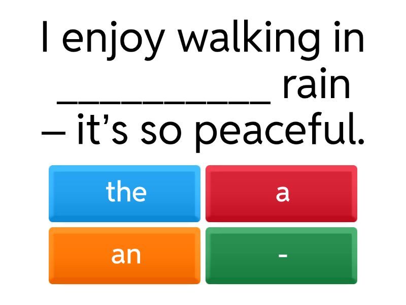 1) I enjoy walking in __________ rain – it’s so peaceful. a) the b) a c) an d) - 2) Some young people don’t see __________ point of studying __________ history. a) the; the b) the; - c) the; a d) a; the 3) I’ll meet you at __________ railway station at 6 o’clock. a) a b) - c) the d) an 4) Do you like __________ action films? a) - b) a c) the d) an 5) I don’t like to see __________ young children playing __________ violent sports like rugby. a) the; - b) a; a c) an; - d) -; - 6) It’s likely I’ll be late for __________ school tomorrow. a) - b) a c) the d) an 7) I love __________ food in this restaurant, but then I always enjoy __________ Italian food. a) the; a b) the; - c) the; the d) -; - 8) All over __________ world, __________ people have similar problems. a) the; - b) the; the c) -; - d) a; the