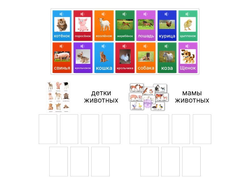 детки животных: Щенок, котёнок, поросёнок, цыпленок, крольчонок, жеребёнок, козлёнок, мамы животных: собака, кошка, свинья, курица, крольчиха, лошадь, коза,
