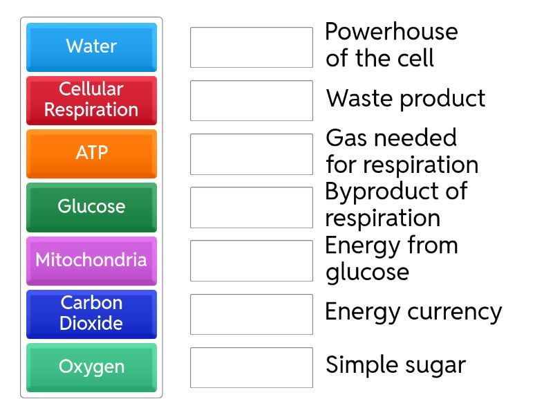 Cellular Respiration - Energy from glucose, Mitochondria - Powerhouse of the cell, Glucose - Simple sugar, ATP - Energy currency, Oxygen - Gas needed for respiration, Carbon Dioxide - Waste product, Water - Byproduct of respiration,