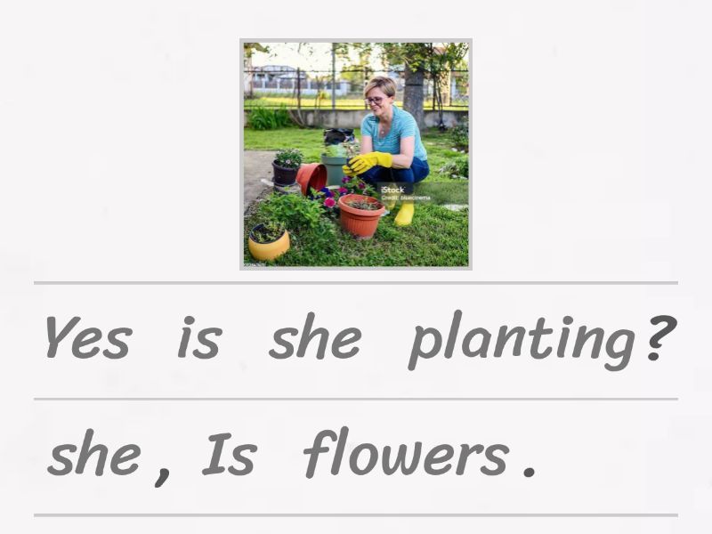 Is she planting flowers? Yes, she is., Are they feeding fishes? No, she is feeding a cat., Are you watering a tree? Yes, we are., Is he kicking a ball? Yes, he is., Is she kicking a ball? No, she is throwing., Are you sleeping Jane? No, I am not. I am tired.,