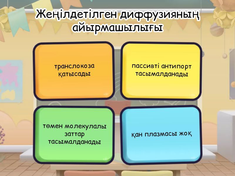 1) Жеңілдетілген диффузияның айырмашылығы a) транслокоза қатысады b) пассивті антипорт тасымалданады c) төмен молекулалы заттар тасымалданады d) қан плазмасы жоқ 2) транслокоза молекуласы-ол a) реакция b) тасымалдаушы нәруыз c) концентрация айырымы d) бағыт 3) б күйіне ауысады… a) заттармен байланысқан нәруыз тасымалдаушы өзінің конформациясын өзгертуі b) мембрананың екінші жағындағы саңылауға ығысуы 4) ”жүгірме” жүйенің әрекеті a) организмде көмірқышқыл газын тасымалдайды b) организмнен көмірқышқыл газын алып кетеді 5) пассивті унипорт-ол… a) заттың мембрана арқылы нәруыз тасымалдаушымен тасылмалдануы b) нәруыз-тасылмалдаушының концентрация градиенті бойынша екі түрлі заттың бір бағытта тасымалдануы
