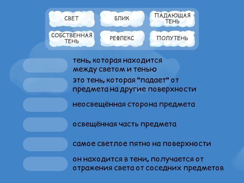 БЛИК - самое светлое пятно на поверхности , СВЕТ - освещённая часть предмета, ПОЛУТЕНЬ - тень, которая находится между светом и тенью, СОБСТВЕННАЯ ТЕНЬ - неосвещённая сторона предмета, РЕФЛЕКС - он находится в тени, получается от отражения света от соседних предметов, ПАДАЮЩАЯ ТЕНЬ - это тень, которая "падает" от предмета на другие поверхности,