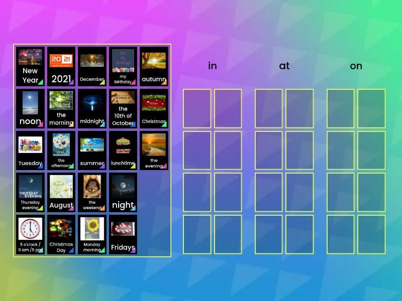 in: the morning, the afternoon, the evening, 2021, autumn, December, summer, August, at: night, 5 o'clock / 5 am /5 pm, the weekend, Christmas, New Year, midnight, lunchtime, noon, on: Fridays, Monday morning, Thursday evening, the 10th of October, Christmas Day, Tuesday, my birthday,