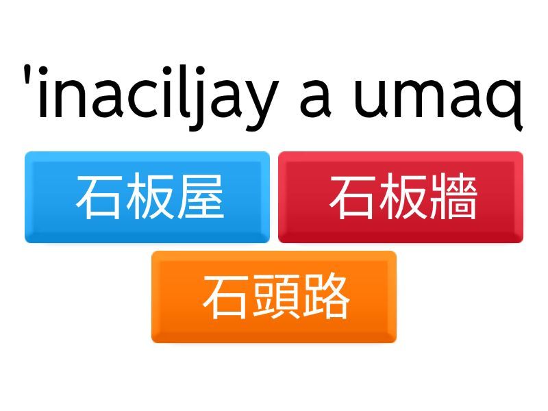 1) 'inaciljay a umaq a) 石板屋 b) 石板牆 c) 石頭路 2) 'inaciljay a djeljep a) 石板屋 b) 石板牆 c) 石頭路 3) 'inaciljay a djalan a) 石板屋 b) 石板牆 c) 石頭路 4) masantalj a) 每一位/每一戶 b) 因素;目的 c) 改變 5) pacugan a) 每一位/每一戶 b) 因素;目的 c) 改變 6) maumalj a) 每一位/每一戶 b) 因素;目的 c) 改變 7) kubaw/kubav a) 室外榖倉 b) 室內糧倉 c) 前院 8) salang a) 室外榖倉 b) 室內糧倉 c) 前院 9) kasasavan a) 室外榖倉 b) 室內糧倉 c) 前院 10) salapelapelj a) 涼爽 b) 悶熱 c) 儲藏的地方 11) zemulek a) 涼爽 b) 悶熱 c) 儲藏的地方 12) papadjengan a) 涼爽 b) 悶熱 c) 儲藏的地方 13) 'emeceng a) 阻擋 b) 人多 c) 人少 14) tjuruvu a) 阻擋 b) 人多 c) 人少 15) mavekelj a) 阻擋 b) 人多 c) 人少 16) 石板屋 a) 'inaciljay a umaq b) 'inaciljay a djeljep c) 'inaciljay a djalan 17) 石板牆 a) 'inaciljay a umaq b) 'inaciljay a djeljep c) 'inaciljay a djalan 18) 石頭路 a) 'inaciljay a umaq b) 'inaciljay a djeljep c) 'inaciljay a djalan 19) 每一位/每一戶 a) masantalj b) pacugan c) maumalj 20) 因素;目的 a) masantalj b) pacugan c) maumalj 21) 改變 a) masantalj b) pacugan c) maumalj 22) 室外榖倉 a) kubaw/kubav b) salang c) kasasavan 23) 室內糧倉 a) kubaw/kubav b) salang c) kasasavan 24) 前院 a) kubaw/kubav b) salang c) kasasavan 25) 涼爽 a) salapelapelj b) zemulezulj c) papadjengan 26) 悶熱 a) salapelapelj b) zemulezulj c) papadjengan 27) 儲藏的地方 a) salapelapelj b) zemulezulj c) papadjengan 28) 阻擋 a) 'emeceng b) tjuruvu c) mavekelj 29) 人多 a) 'emeceng b) tjuruvu c) mavekelj 30) 人少 a) 'emeceng b) tjuruvu c) mavekelj