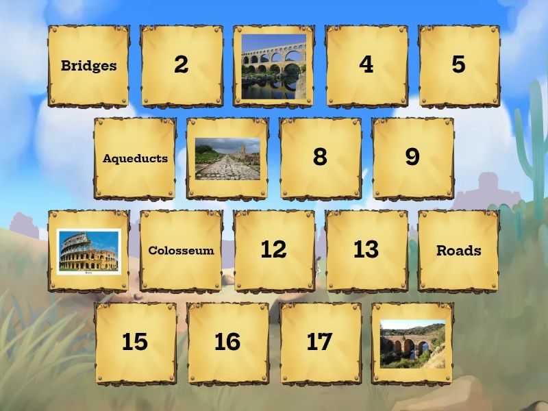 Roads, Colosseum, Aqueducts, Bridges, Latin word for Road - Via, Arches were used because... - architecturally strong, The amount of highways leading to the city of Rome - 29, bridges built in the their empire - 900, Romans were the first to harness - Water (hydro) power,