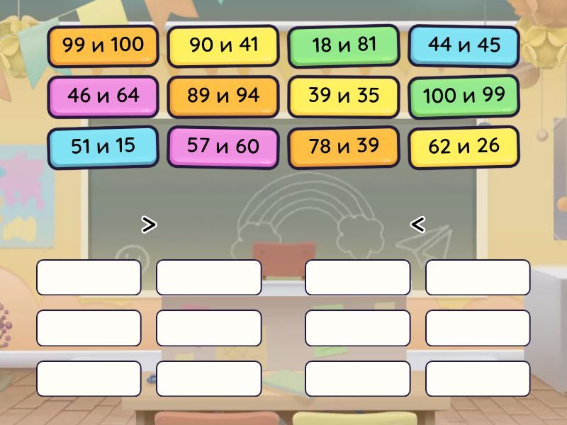 >: 62 и 26, 78 и 39, 90 и 41, 51 и 15, 100 и 99, 39 и 35, <: 46 и 64, 57 и 60, 44 и 45, 99 и 100, 18 и 81, 89 и 94,