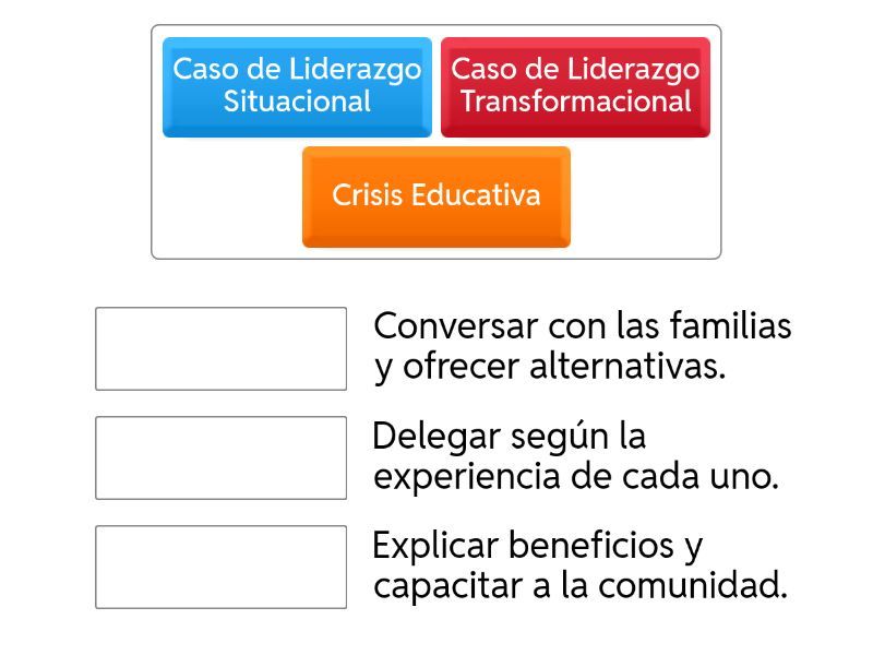 Crisis Educativa - Conversar con las familias y ofrecer alternativas., Caso de Liderazgo Transformacional - Explicar beneficios y capacitar a la comunidad., Caso de Liderazgo Situacional - Delegar según la experiencia de cada uno.,