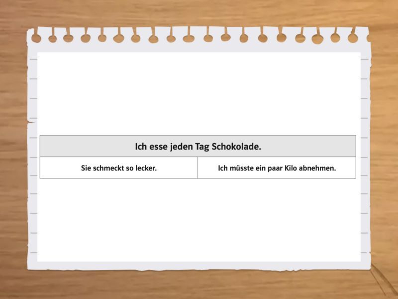 Da/weil Schokolade so lecker schmeckt, esse ich sie jeden Tag. Obwohl ich ein paar Kilo abnehmen müsste, esse ich Schokolade jeden Tag., Da/weil das Auto schneller geht und bequem ist, fahre ich damit (mit dem Auto) zur Arbeit. Obwohl ich jeden Tag eine halbe Stunde im Stau stehe, fahre ich mit dem Auto zur Arbeit. . , Da/weil das Wetter so schön ist, gehe ich jetzt erst mal eine Stunde im Park spazieren. Obwohl ich eigentlich das Projekt fertig machen müsste, gehe ich jetzt erst mal eine Stunde im Park spazieren., Da/weil Obst und Gemüse auf dem Markt besonders frisch ist, kaufe ich es da. Obwohl Gemüse und Obst auf dem Markt teurer als im Supermarkt ist, kaufe ich es da (auf dem Markt)., Da/weil Elisa kleine Kinder liebt, möchte sie Erzieherin werden. Obwohl diese Arbeit leider sehr schlecht bezahlt ist, möchte Elisa Erzieherin werden. , Da/weil Nicolas sehr gut in Methematik ist, hilft er seinem kleinen Bruder bei Mathe-Hausaufgaben. Obwohl Nicolas eigentlich Physik üben müsste, hilft er seinem kleinen Bruder bei Mathe-Hausaufgaben., Da/weil Daniel und seine Mannschaft dieses Jahr unbedingt den Pokal gewinnen wollen, trainieren sie fast jeden Tag. Obwohl Daniels Knie weh tut, trainiert er jeden Tag mit seiner Mannschaft.,