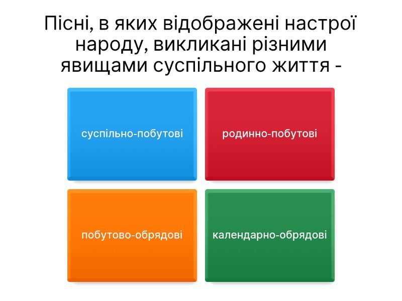 1) Пісні, в яких відображені настрої народу, викликані різними явищами суспільного життя - a) суспільно-побутові b) родинно-побутові c) побутово-обрядові d) календарно-обрядові 2) В ніч на 7 липня хлопці і дівчата збиралися біля вогнищ, стрибали через них, влаштували ігри, дівчата пускали вінки на воду й дивилися, куди вони попливуть, співали пісні, які називалися a) обжинкові b) веснянки c) купальські d) русальні 3) Водіння «кози» супроводжує календарно-обрядову пісню a) купальську b) жниварську c) веснянку d) щедрівку 4) На які три основні роди поділяють літературу? a) міфологія, лірика, епос b) епос, драма, магія c) епос, ліро-епос, лірика d) епос, лірика, драма 5) Яка з перелічених нижче ознак НЕ притаманна фольклорним творам? a) усність b) колективність c) авторська позиція d) варіативність 6) До фольклорних жанрів не належить: a) легенда b) пісня c) казка d) роман 7) Пісні, що прославляли прихід тепла, пробудження землі... a) щедрівки b) русальні c) веснянки d) колискові 8) Пісні, що уславляли працю землеробів... a) гаївки b) купальські c) жниварські d) веснянки 9) У яких суспільно-побутових піснях звучить туга за рідним краєм, домівкою, родиною; протест проти панів, які насильно віддали у військо українських хлопців-кріпаків? a) козацьких b) рекрутських c) кріпацьких d) бурлацьких 10) Календарно-обрядові пісні не пов'язані з: a) порами року b) сільським господарством c) явищами природи d) історичними подіями 11) Що в перекладі означає поняття «фольклор»? a) народ b) народна традиція c) народна мудрість d) народний побут 12) Незвичайність і загадковість подій, трагічність у розв'язанні конфлікту, похмурий колорит, метаморфози, діалог, фантастичні елементи‎це жанрові ознаки a) балади b) календарно-обрядової пісні c) історичної пісні d) соціально-побутової пісні