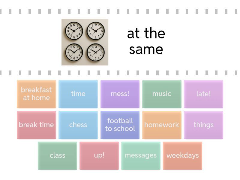 time - at the same, up! - Hurry , breakfast at home - have , class - meet before, things - lose, football to school - bring , messages - send text, weekdays - on, mess! - What a , chess - play , break time - at, homework - do, music - listen to, late! - We're,